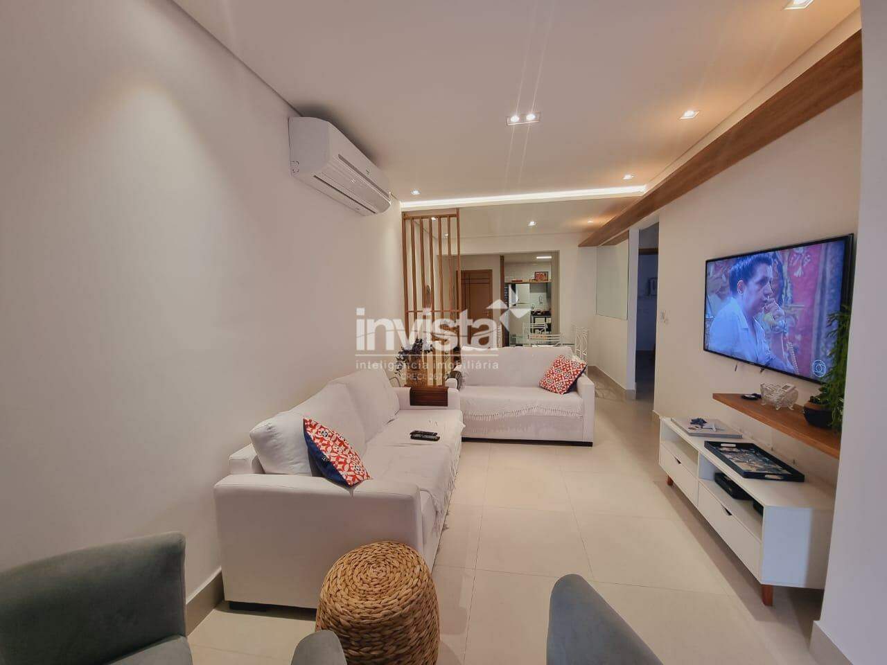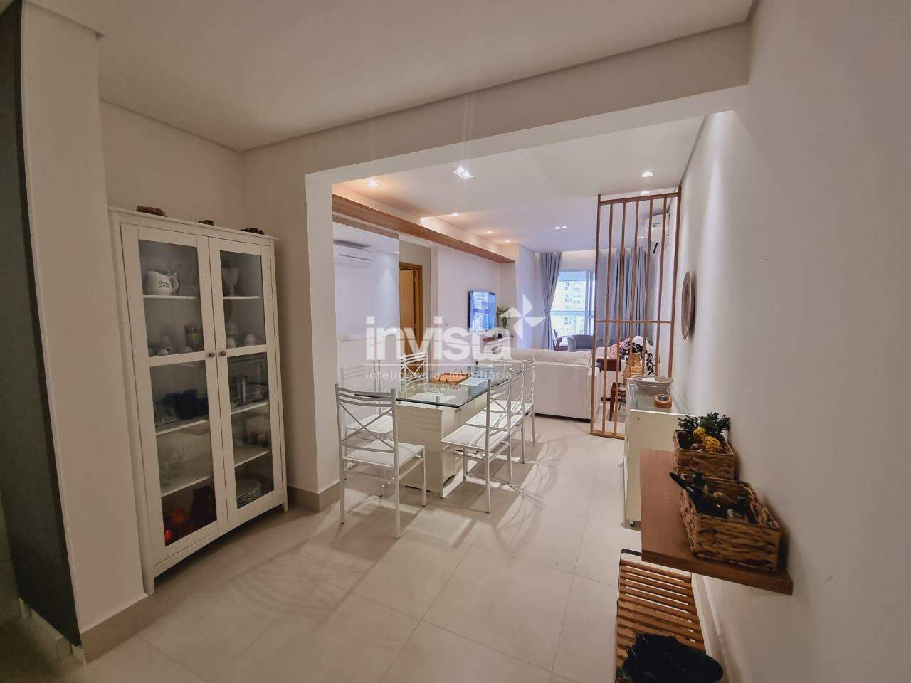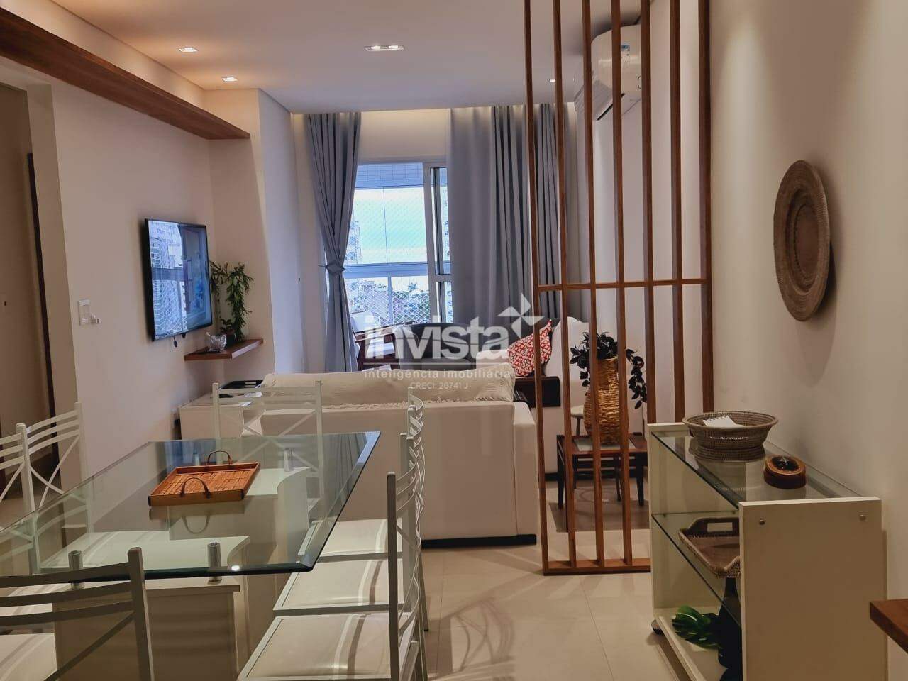 São 3 dormitórios, originalmente 1 suíte, porém o WC de serviço foi revertido para a 2 suíte, WC social, sala para 2 ambientes, varanda com vista para o mar, cozinha com conceito aberto, área de serviço e 2 vagas de garagem demarcadas.