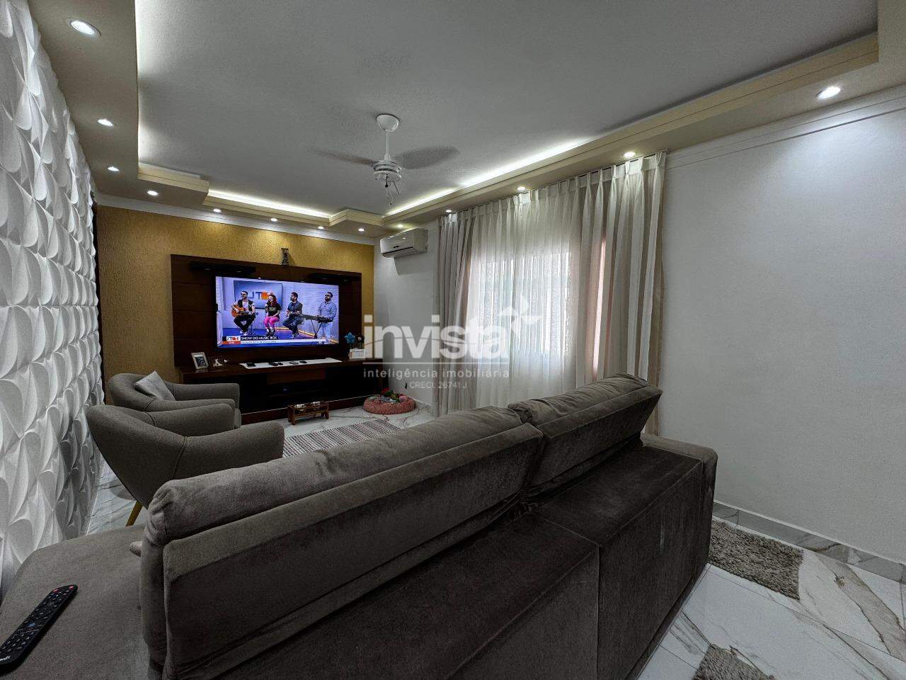Sala espaçosa para dois ambientes, com piso em porcelanato, iluminação em LED, ventilador de teto e ar-condicionado – perfeita para receber visitas ou curtir com a família.