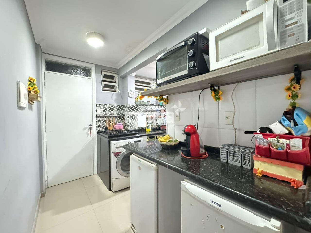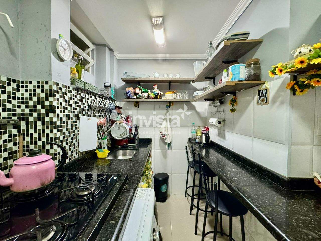 O imóvel passou por uma reforma moderna, conta com cozinha equipada com cooktop, armários planejados e uma elegante bancada de mármore.