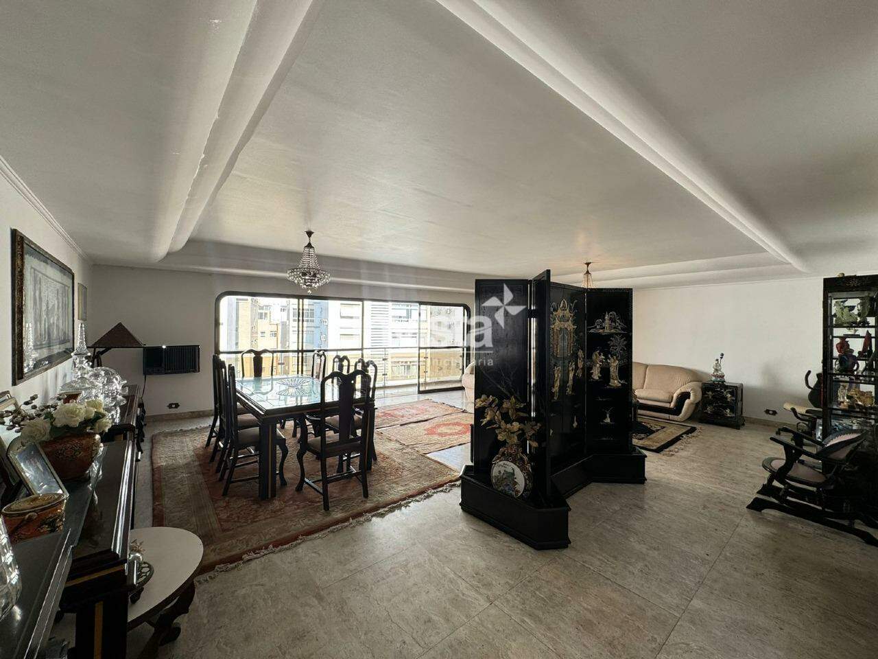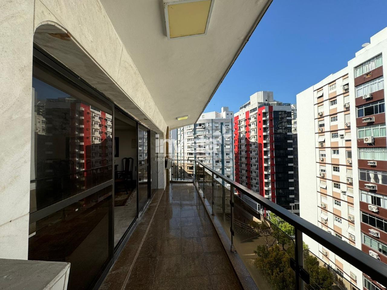 Sala ampla para dois ambientes, bem iluminada, com sacada agradável e elevador social com acesso direto à sala de estar
