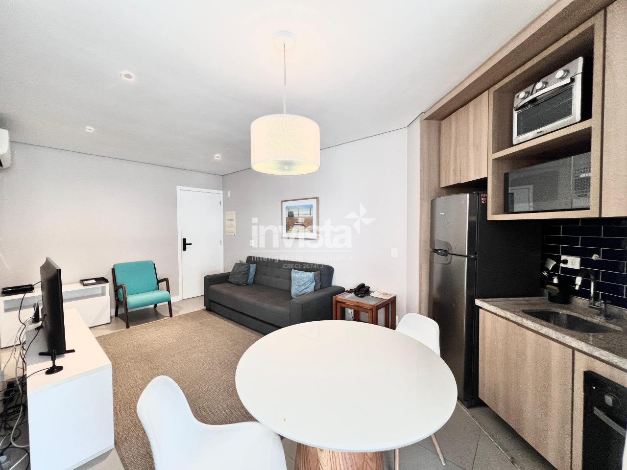O apartamento conta com ampla sacada, um dormitório, sala com cozinha integrada e banheiro.