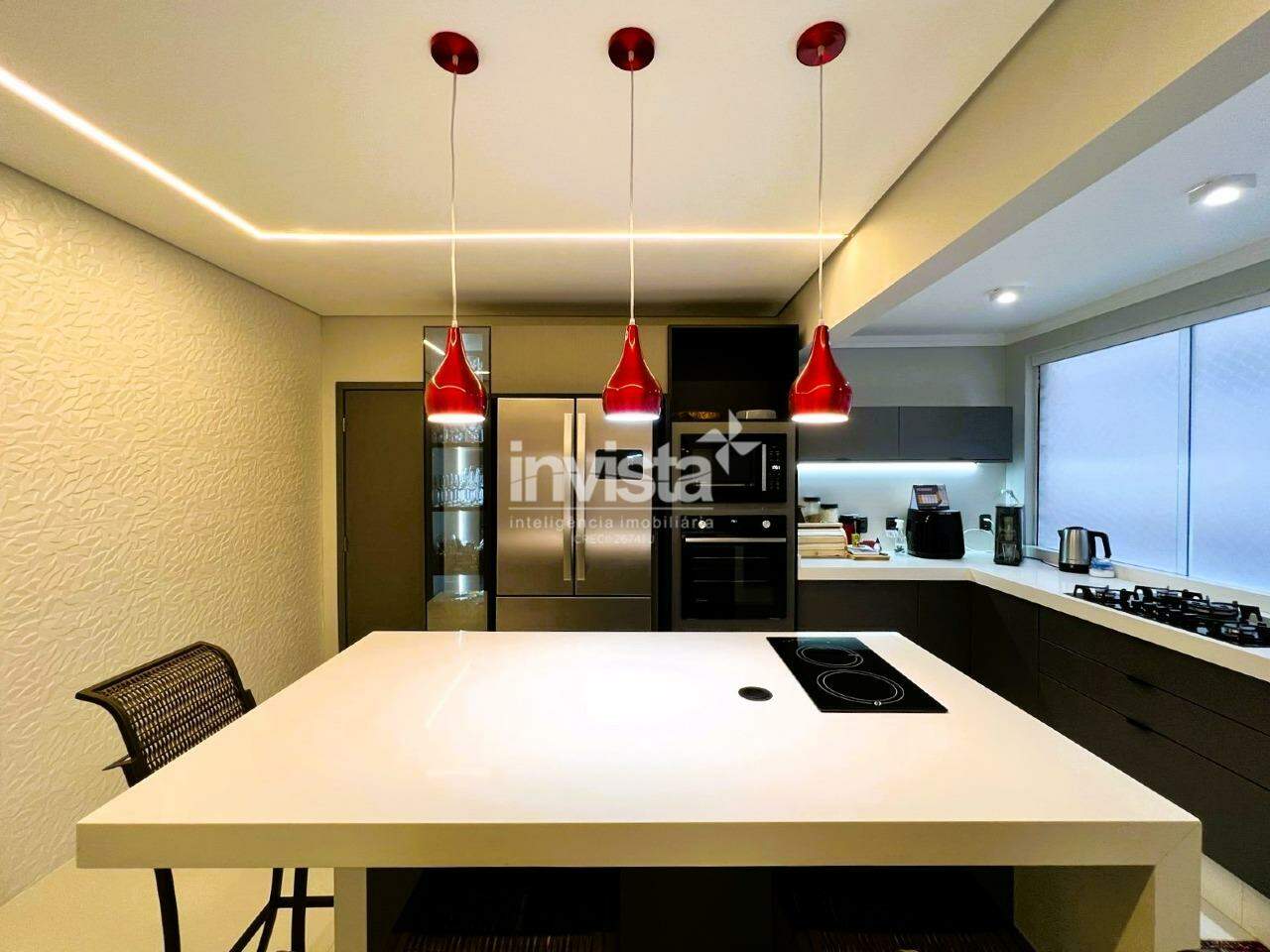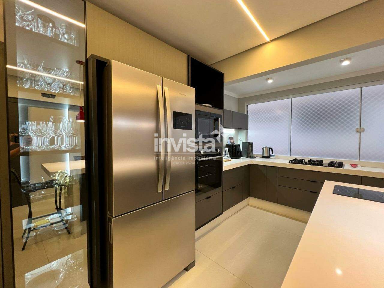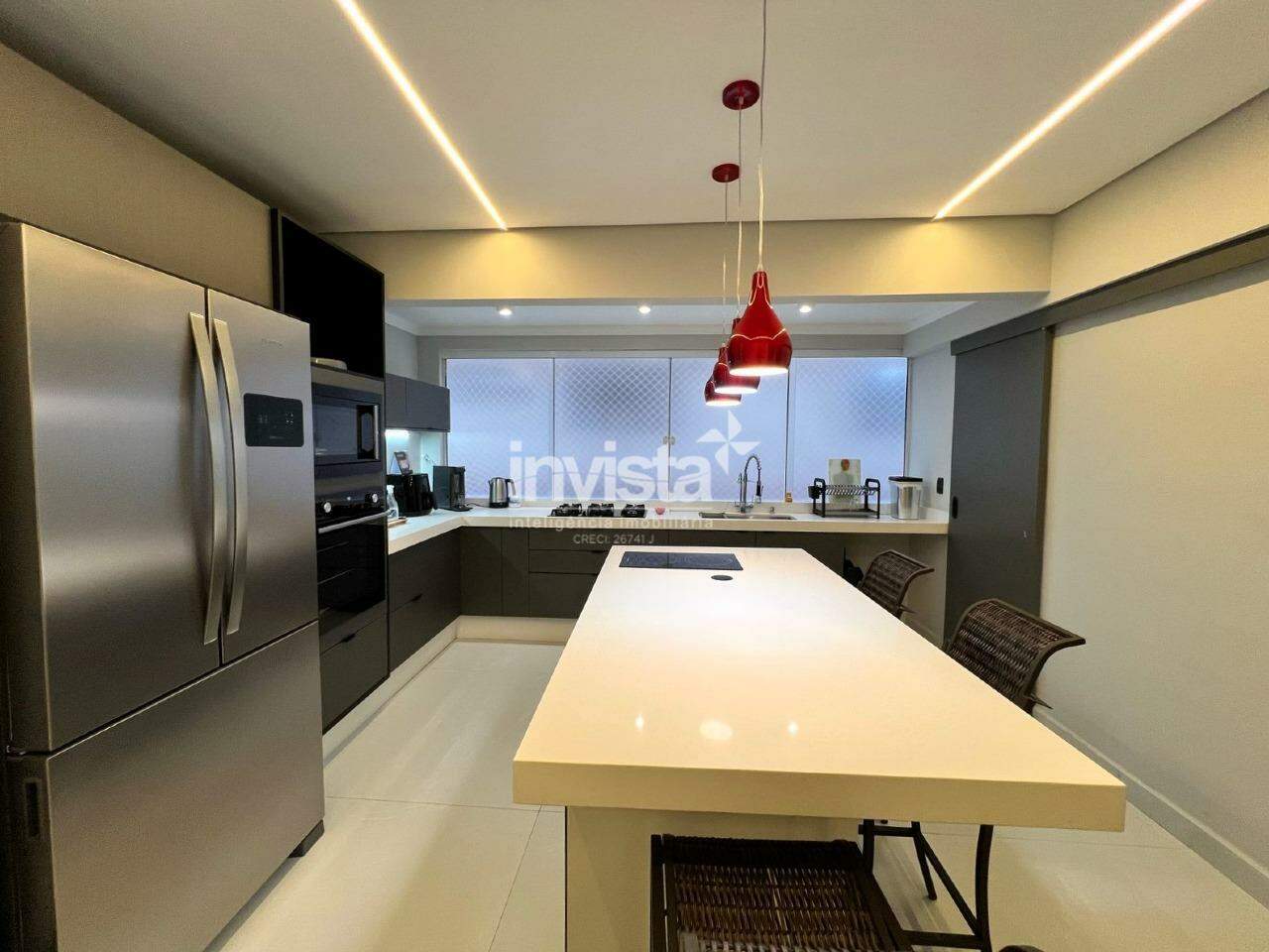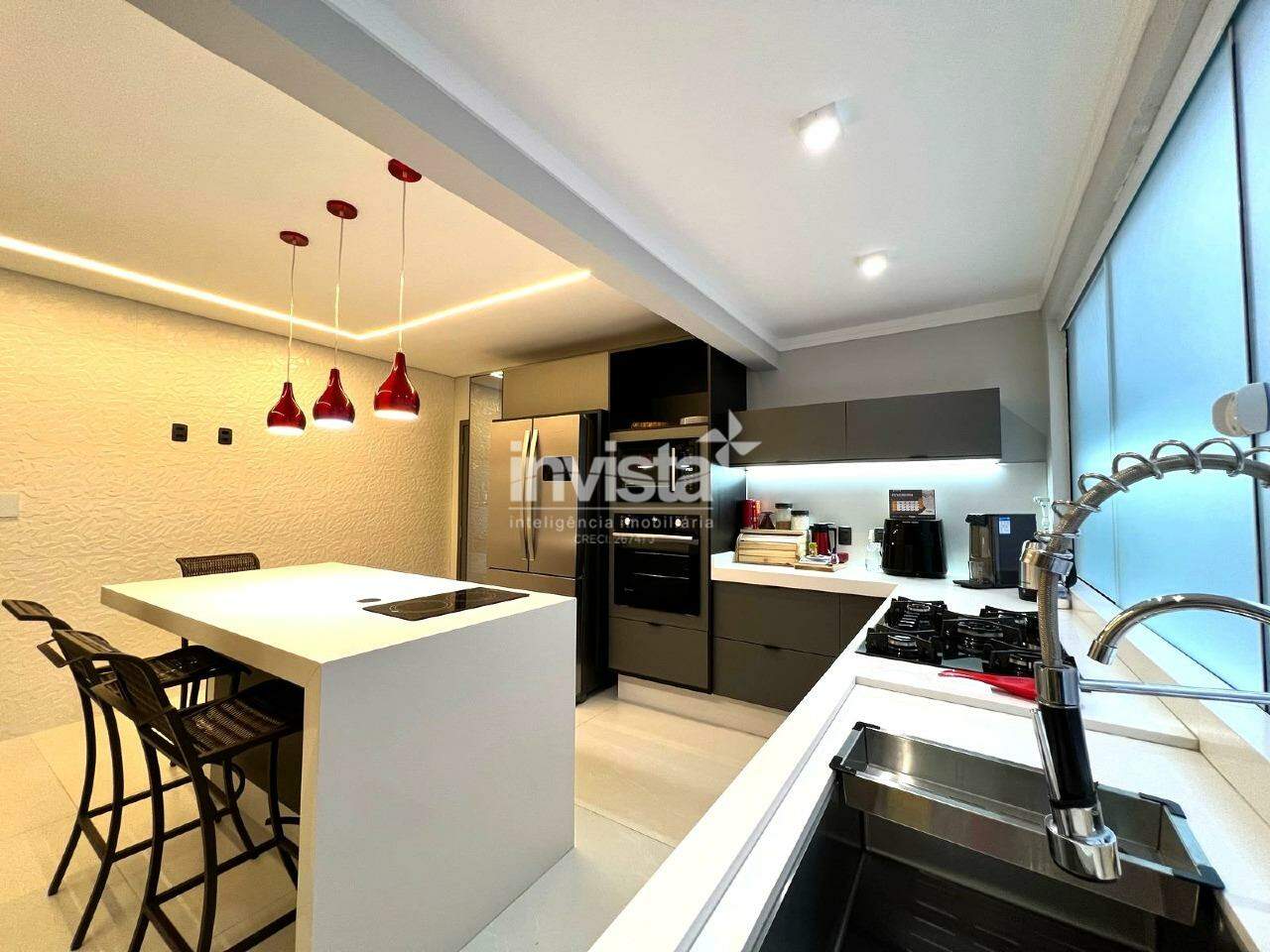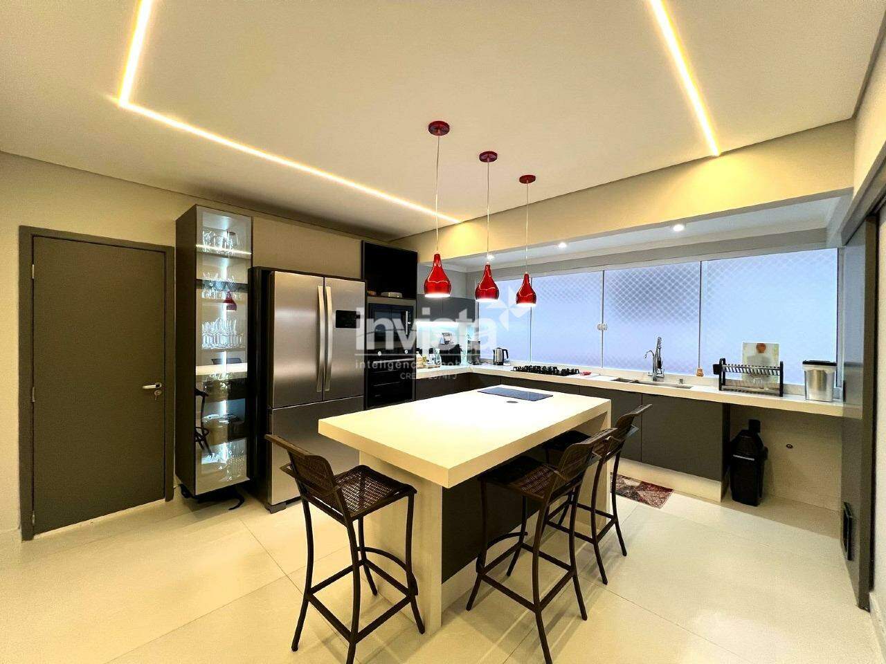 A cozinha é totalmente equipada, com uma elegante ilha em quartzo branco e uma linda cristaleira. Há ainda uma ótima despensa e uma área de serviço ampla.