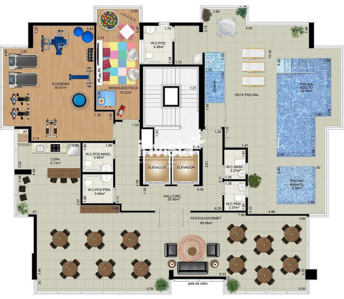 Academia; Piscina; Churrasqueira; Brinquedoteca; Salão de Festas; Espaço Gourmet
