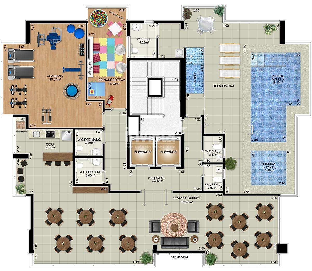 Academia; Piscina; Churrasqueira; Brinquedoteca; Salão de Festas; Espaço Gourmet
