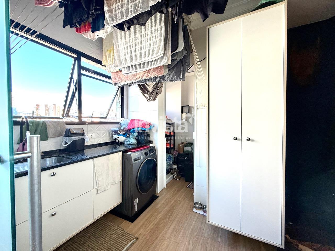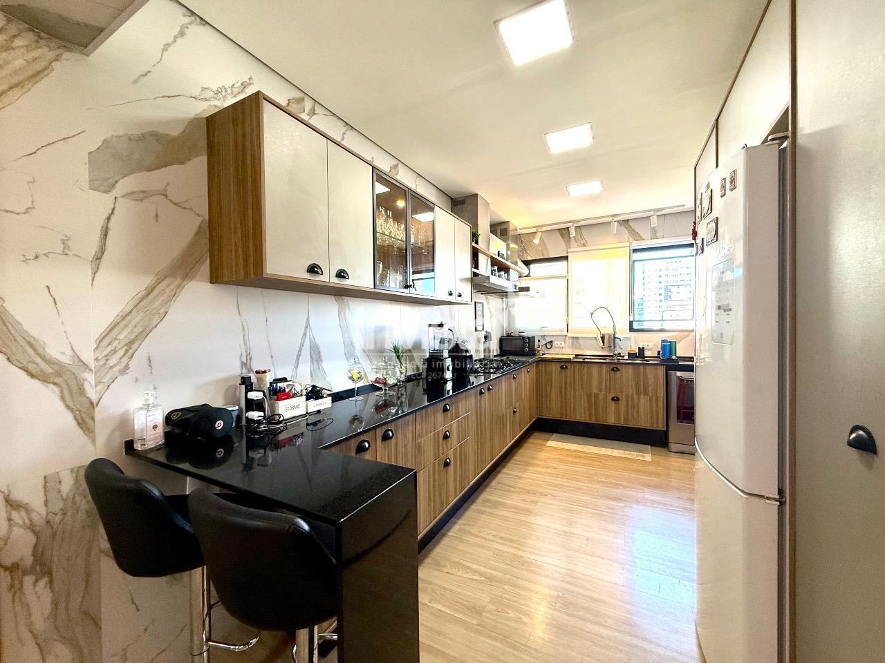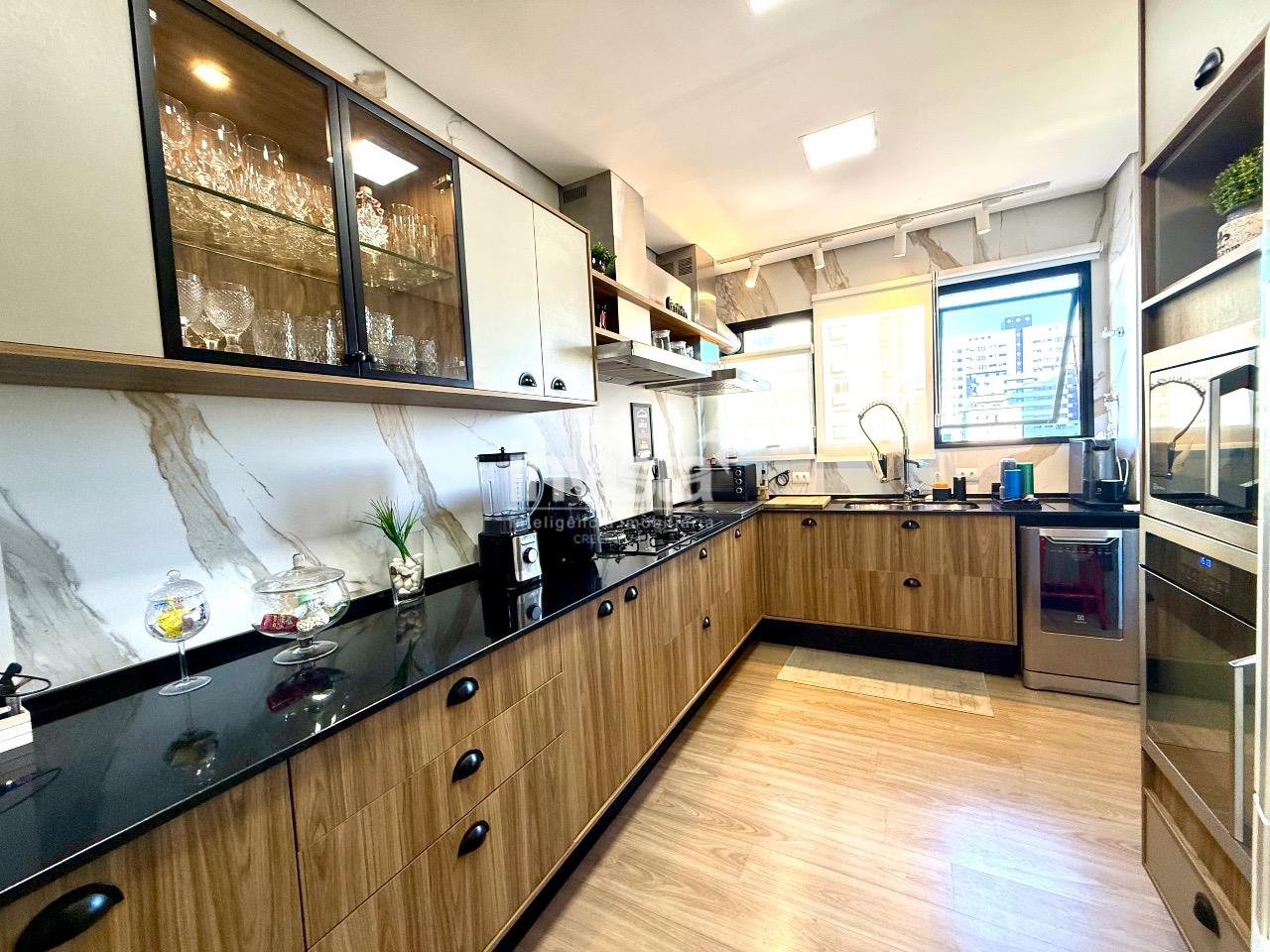 A cozinha impressiona: ampla, com uma charmosa copinha, armários planejados e uma churrasqueira elétrica embutida na bancada, tornando cada momento ainda mais especial. O apartamento também conta com uma área de serviço espaçosa e um total de cinco banheiros, incluindo lavabo e banheiro de serviço.