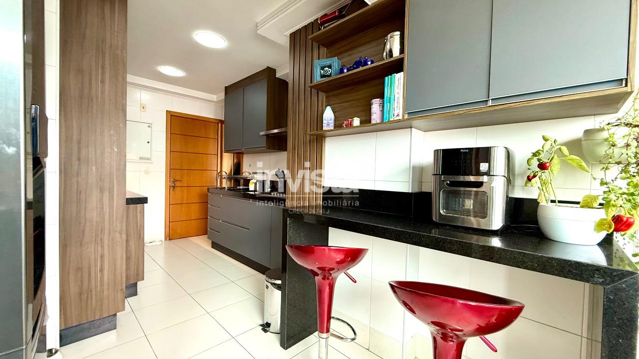A cozinha é espaçosa e planejada, com acesso direto à varanda gourmet, área de serviço ventilada com janelão e banheiro de serviço.