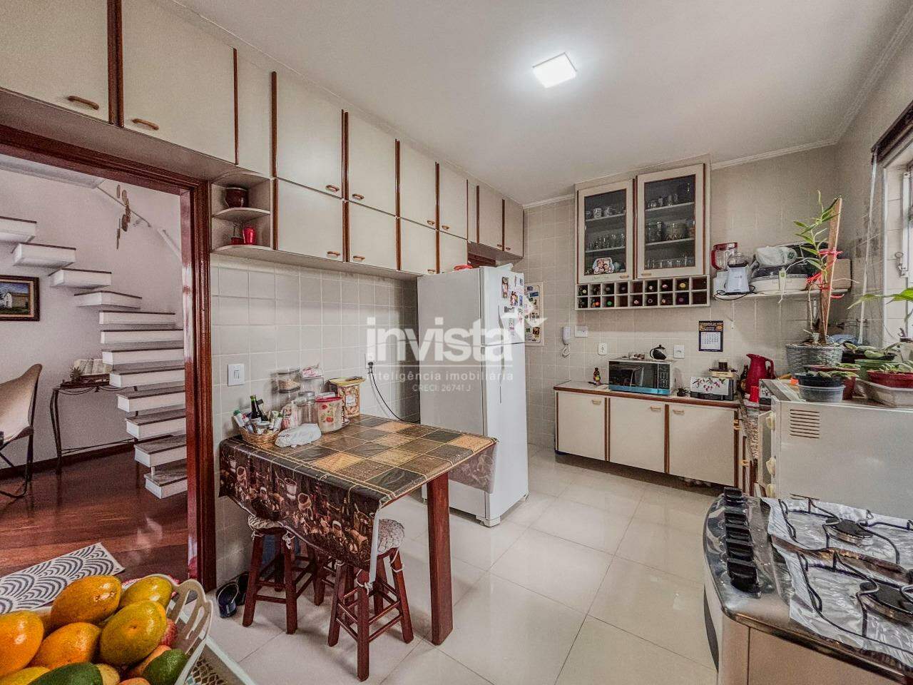 1º Pavimento sala ampla, 3 dormitórios sendo 1 suíte, banheiro social, cozinha e área de serviço e escada de acesso ao pavimento superior.