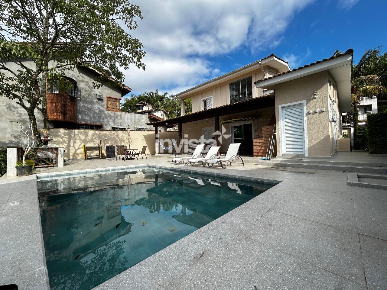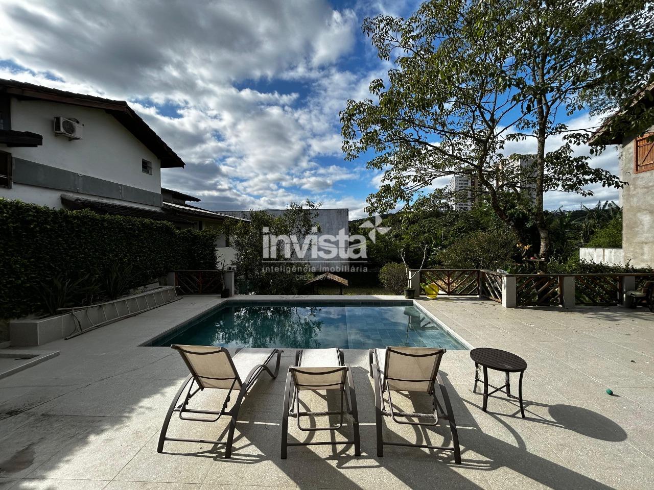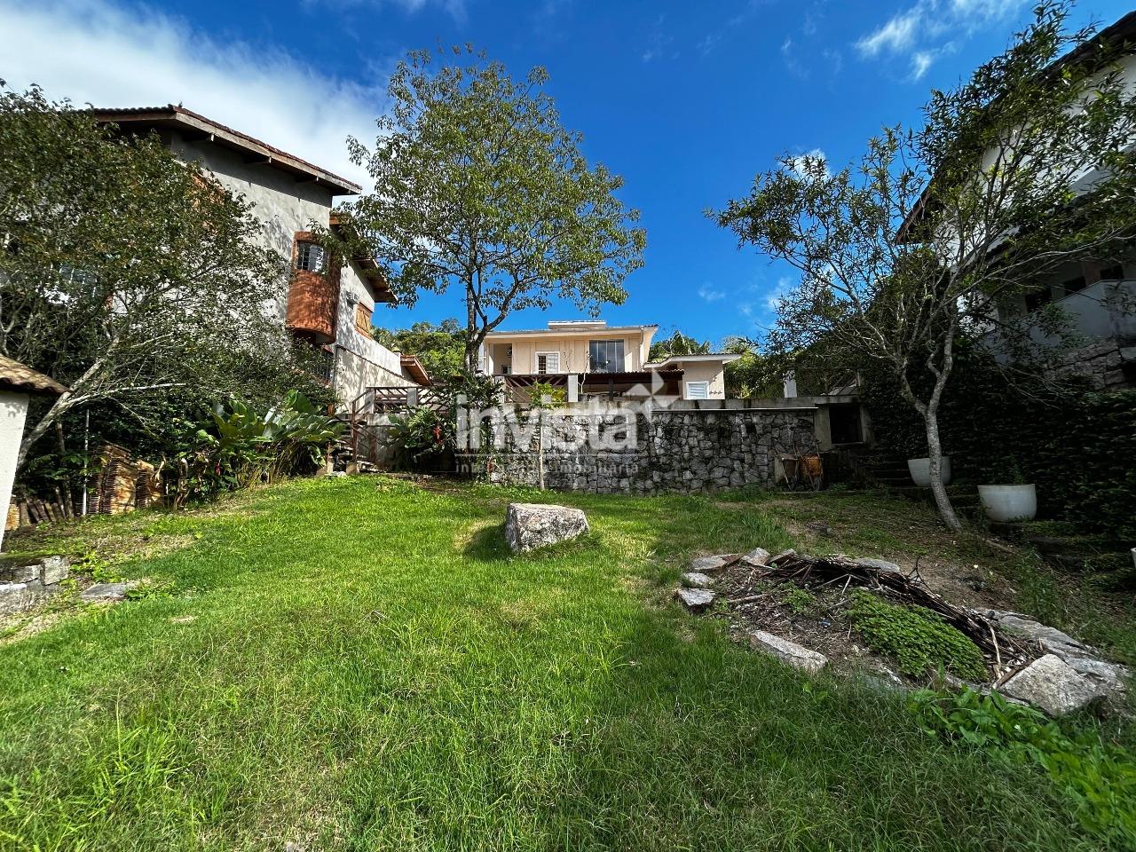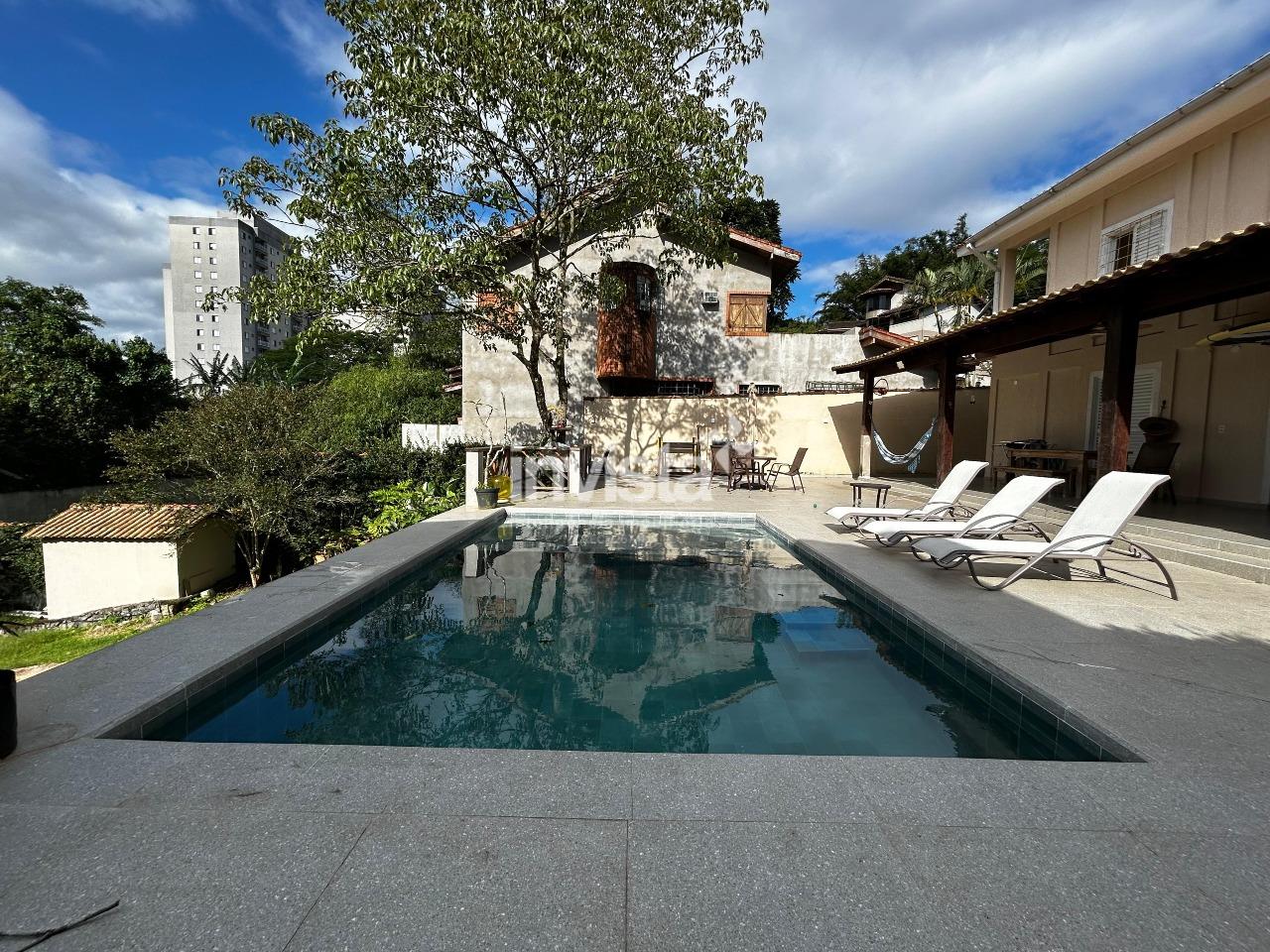 A área externa possui churrasqueira, piscina e um quintal com muito verde e árvores frutíferas.